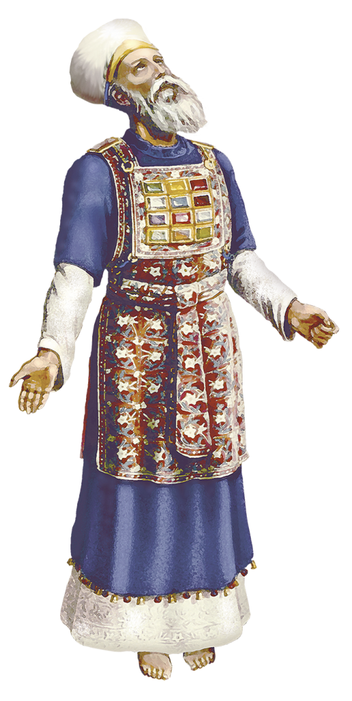 Image opposite: the High Priest in full regalia. The azure, purple and scarlet pomegranates and golden bells are clearly visible at the bottom of his robe. © Theo Truschel/archeobiblion.