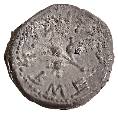 The coins minted by the rebels feature a rod with three pomegranates on the obverse of the coin and, on the reverse, a cup probably containing the Omer offering - a golden utensil used on the second day of Passover when a measure of barley symbolizing the first-fruits was offered to the Temple. This cup is similar to the one that might have been used by the priests in the Jerusalem Temple. A letter on the reverse indicates the date of issue. The letter aleph corresponds to the first year of the revolt against the Romans.