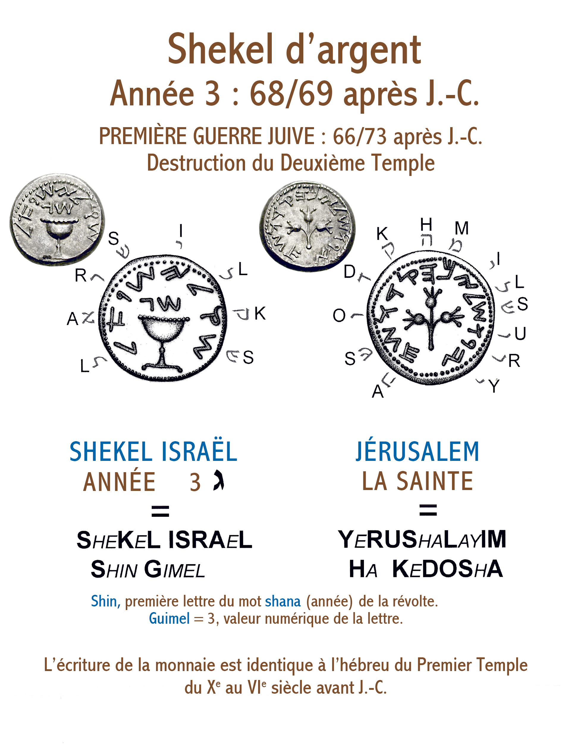 During the revolt, the Jews created their own silver and bronze coins representing shekels, half-shekels and quarter-shekels, on which were inscribed not only the year of the revolt but also political and symbolic elements with evocative messages and signs.