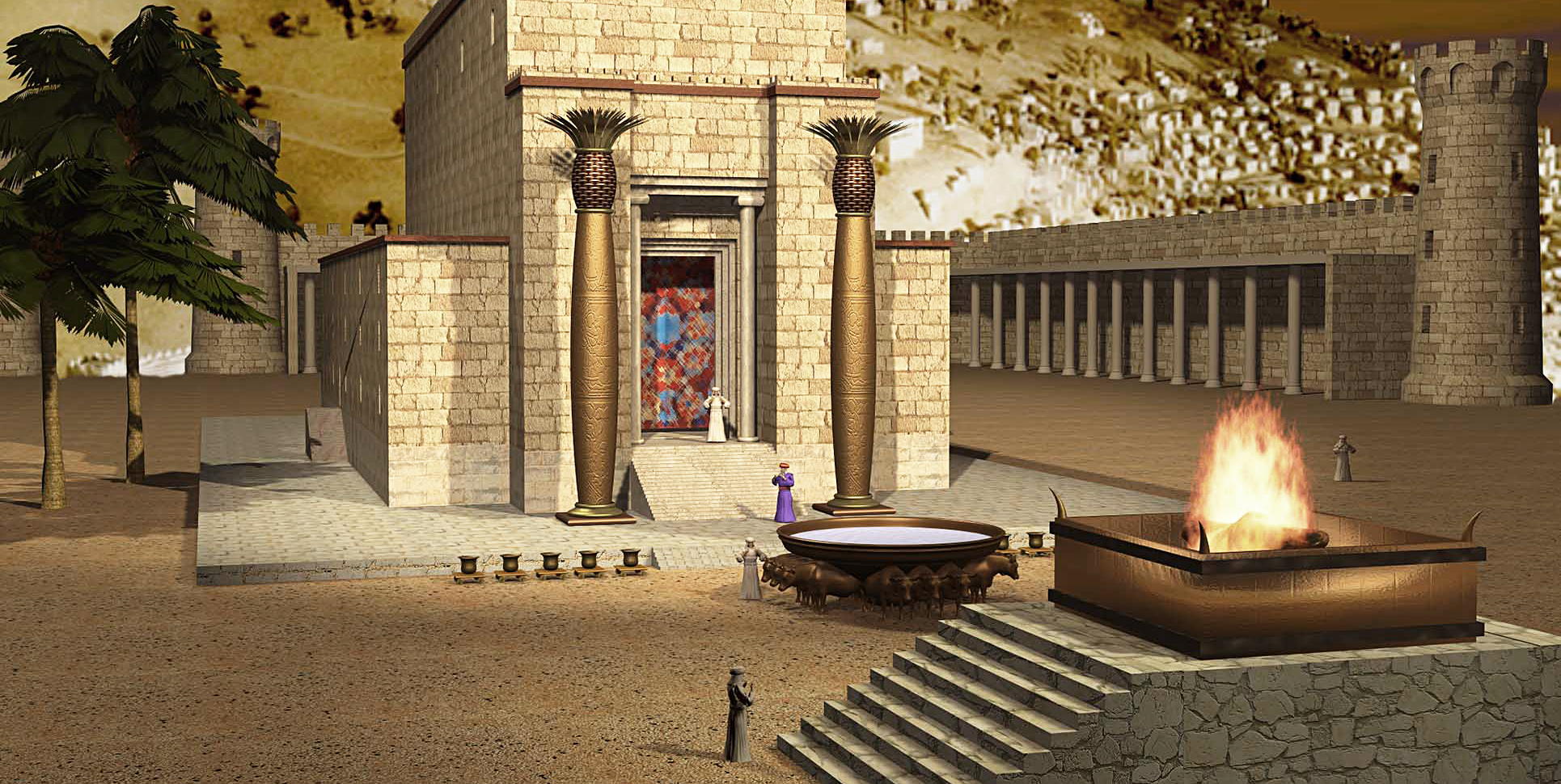 An artistic proposal for a 3d reconstruction of the Temple of Jerusalem in the time of King Solomon. Version with covered vestibule. © Theo Truschel/archeobiblion.