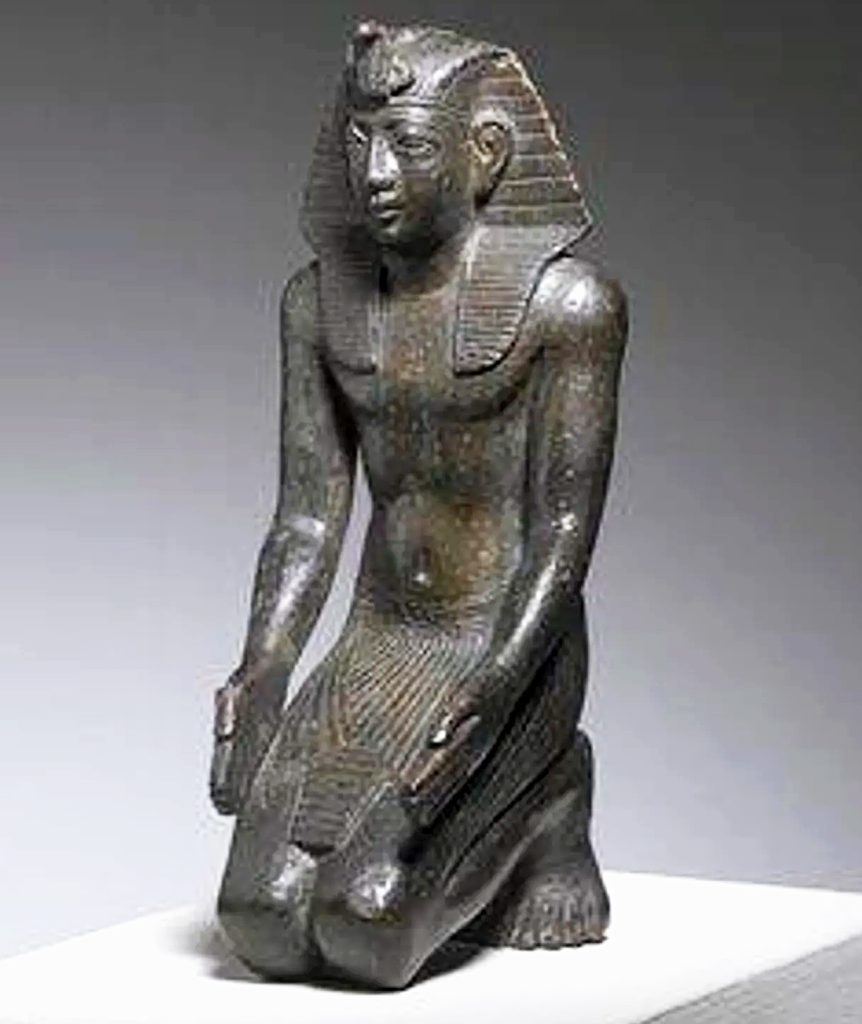 Image ci-contre : statuette agenouillée du roi Neco, bronze, 14 cm de haut, vers 610–595 avant J.-C., Brooklyn Museum. D.R.