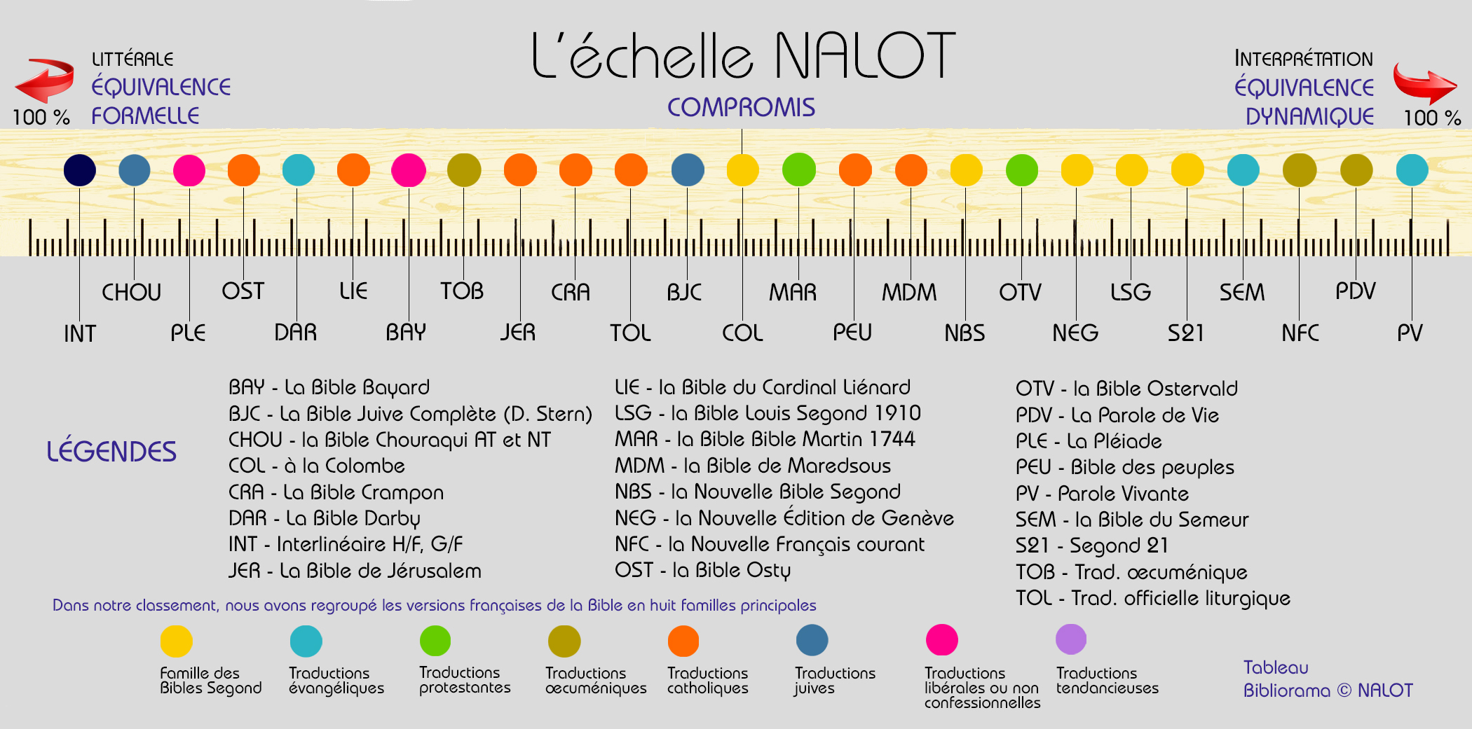 L’échelle NALOT est un outil qui permet, en un seul coup d’œil, de repérer sur une règle la position des traductions françaises de la Bible, allant de la plus littérale à la plus dynamique.